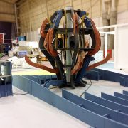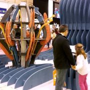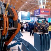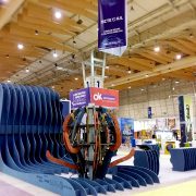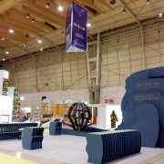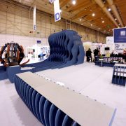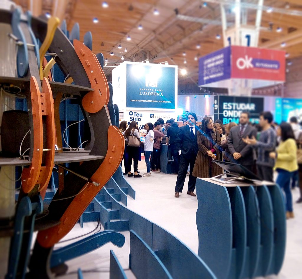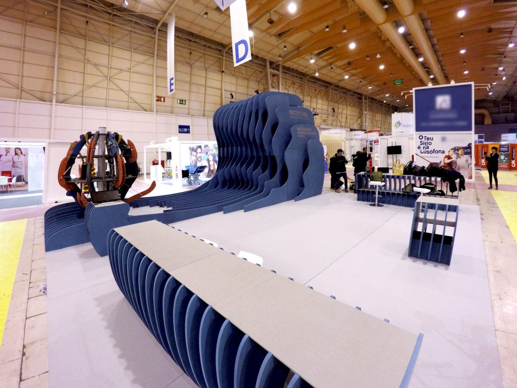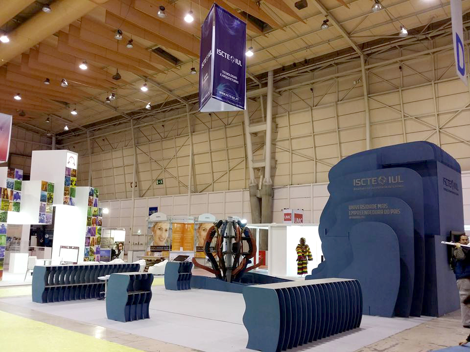 So, this stand was developed under the idea of a wave that emerged from the robotic flower and collided with the storage unit, creating the big volume and leaving the rest of the area almost empty, inviting the visitors inside the stand. This empty area had different types of information desks, some for the institutional info of the university, others to present some projects being developed at ISCTE-IUL.