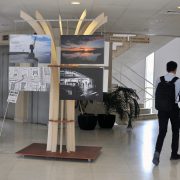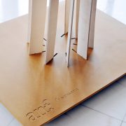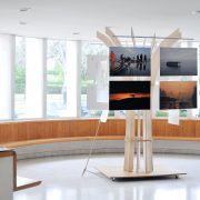 It was conceived starting from the simplest form of a tree: trunk and branches as slim elegant strips of plywood, slightly twisted, united by coloured rings. The photographs were then sustained from these branches, like leaves, arranged by thematic groups.